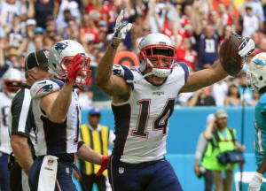 Patriots wide receiver Michael Floyd (14) celebrates a touchdown during the second quarter of an NFL football game against the Miami Dolphins at Hard Rock Stadium. Mandatory Credit: Reinhold Matay-USA TODAY Sports |