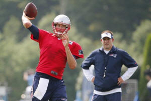 Patriots quarterback Tom Brady (12) throws during training camp at