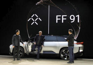 CEO of LeEco, as he exits a Faraday Future FF 91 electric car during