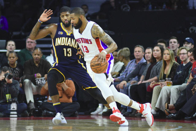 Pistons forward Marcus Morris (13) moves to the basket as Indiana