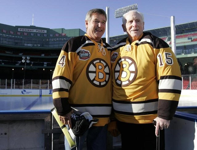 Former Boston Bruins greats Bobby Orr (L) and Milt Schmidt