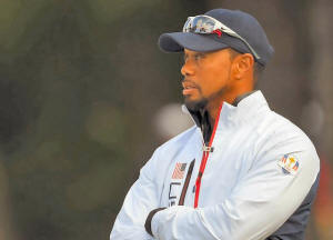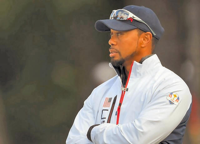 Team USA vice-captain Tiger Woods talk at the 13th green during the