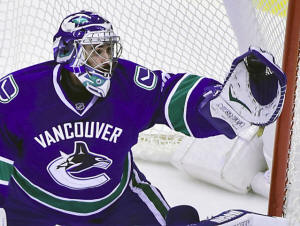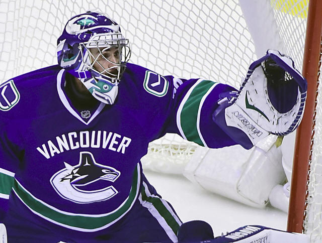 Canucks goaltender Ryan Miller (30) stops a shot on net by the