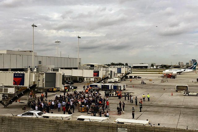 Travelers are evacuated out of the terminal and onto the tarmac after airport shooting at