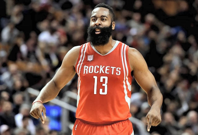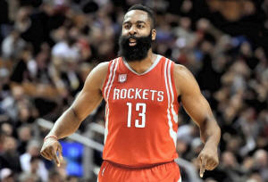 Rockets guard James Harden (13) reacts after sinking a basket during