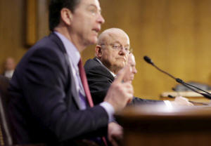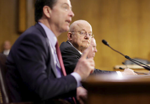 Director of National Intelligence (DNI) James Clapper listens as FBI