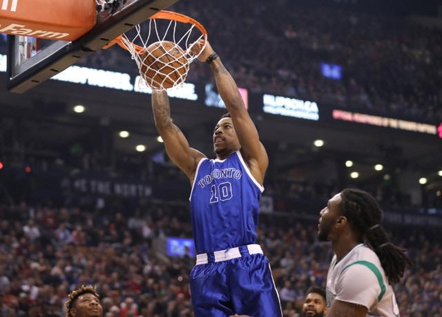 Raptors guard DeMar DeRozan (10) dunks the ball against the Boston