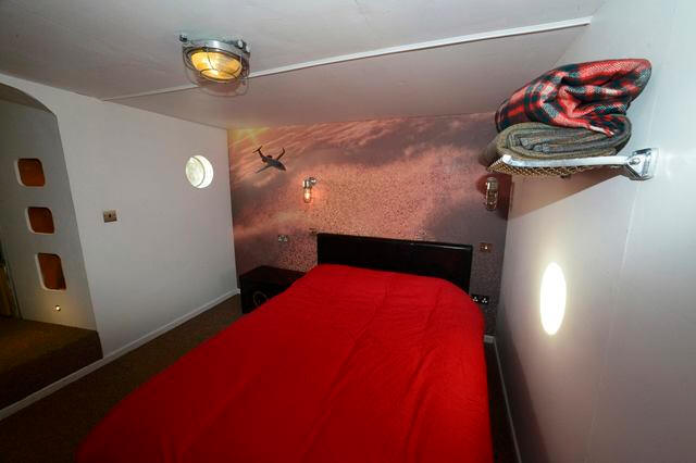behind the cockpit, the 1970s JetStar sleeps 4 people on a