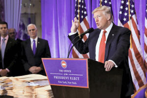 Vice President-elect Mike Pence is seen in the background as U.S.