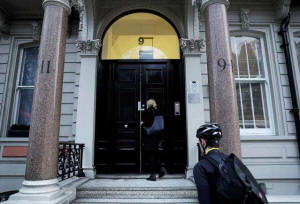 People enter the building housing the offices of Orbis Buiness