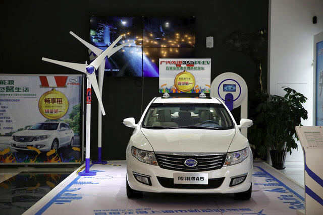 A Trumpchi GA5 hybrid electric car is displayed at an electric car
