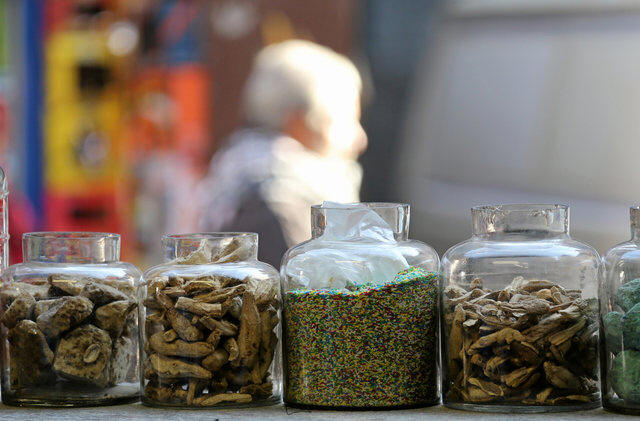 outside a decades-old herbal spice shop with pyramid-shaped stacks