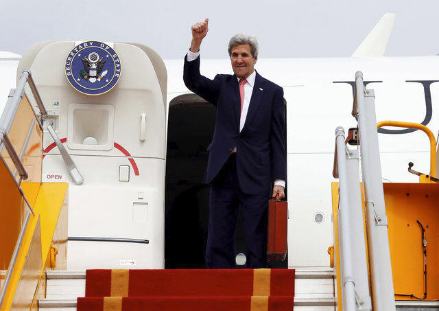 Secretary of State John Kerry waves as he boards his plane at Hanoi