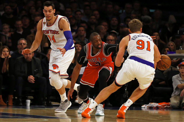 Bulls guard Dwyane Wade (3) looses the ball to New York Knicks