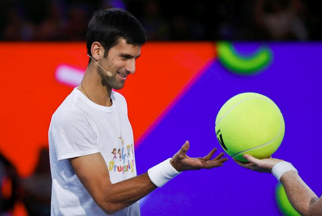 Serbia's Novak Djokovic is given a large tennis ball during a