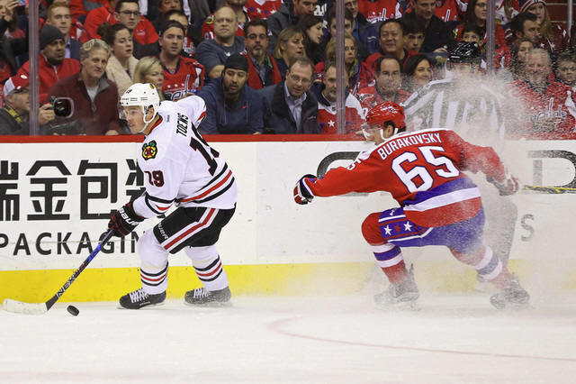 Jonathan Toews (19) skates with the puck as Washington Capitals left