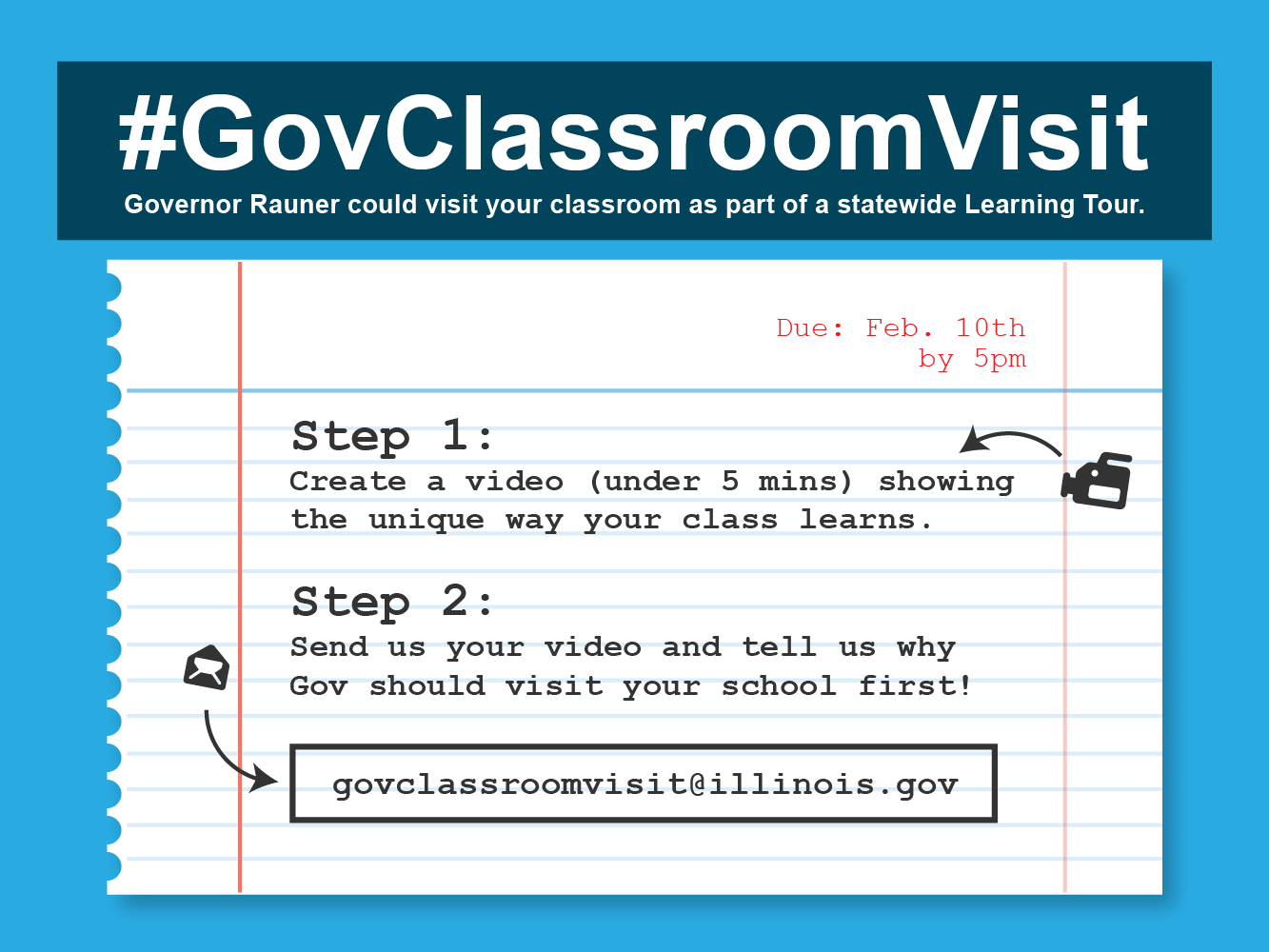 – Governor Bruce Rauner today announced on his Facebook page #GovClassroomVisit