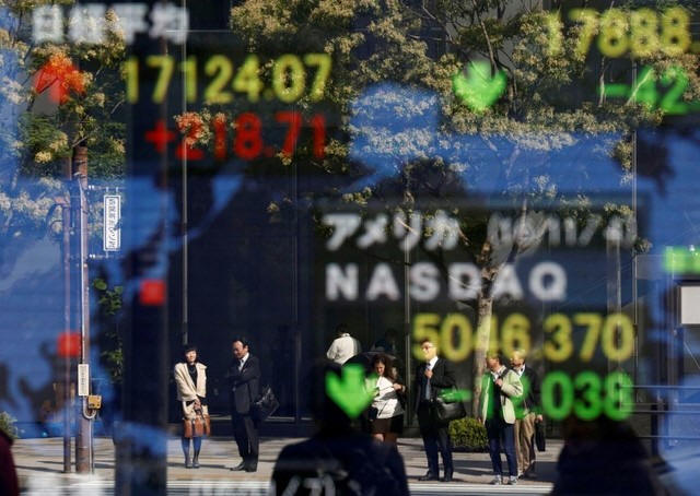People are reflected in a display showing the Nikkei average (top in