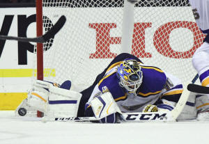 Blues goalie Carter Hutton (40) makes a save in the third period of