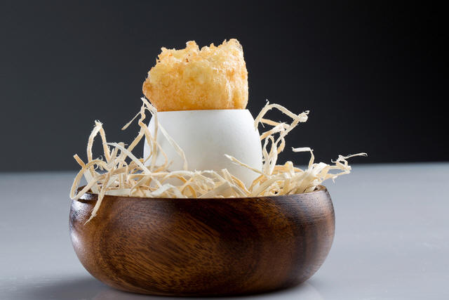crispy egg yolk with mushroom jelly, a playful but perfect