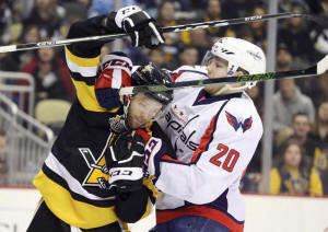 Capitals center Lars Eller (20) defends against Pittsburgh Penguins