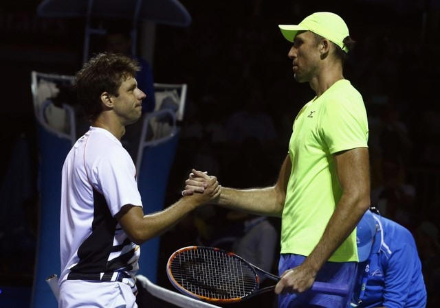 Croatia's Ivo Karlovic (R) shakes hands after winning his Men's