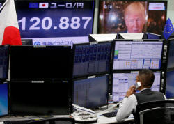 An employee of a foreign exchange trading company works near