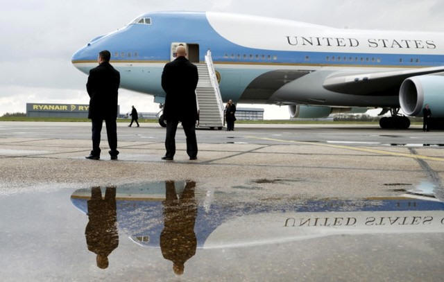Barack Obama arrives to board Air Force One at Stansted Airport in
