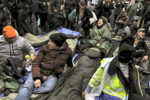 Demonstrators chant while in their sleeping bags outside of Goldman