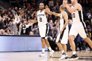 Spurs small forward Kawhi Leonard (2) celebrates with teammate Tony