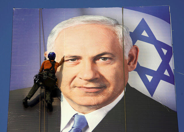 A worker installs a banner depicting Israel's Prime Minister