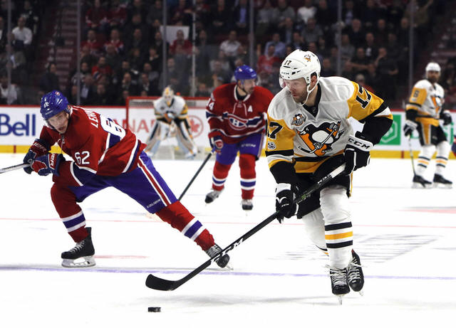 Penguins right wing Bryan Rust (17) plays the puck against Montreal