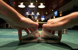 A dealer shuffles a deck of cards during a poker game at a casino in