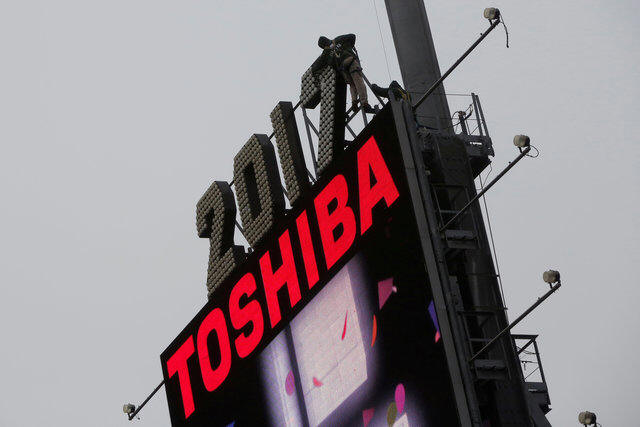 Workers prepare the new year's eve numerals above a Toshiba sign in