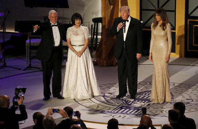 stage with Vice President-elect Mike Pence (L) and his wife Karen at