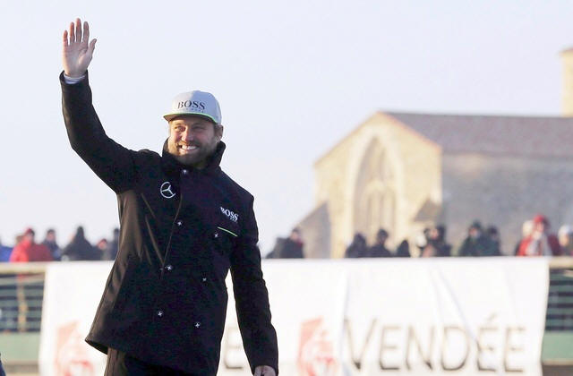 British sailor Alex Thomson waves as he completes the solo