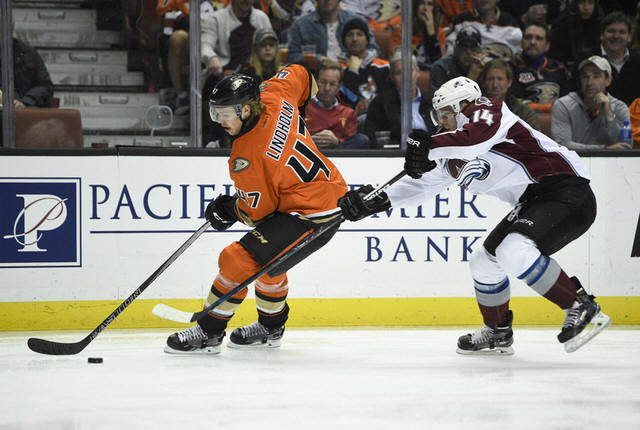 Anaheim Ducks defenseman Hampus Lindholm (47) moves the puck ahead