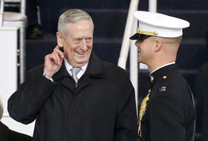 James Mattis speaks with a Marine guard before the Inaugural parade