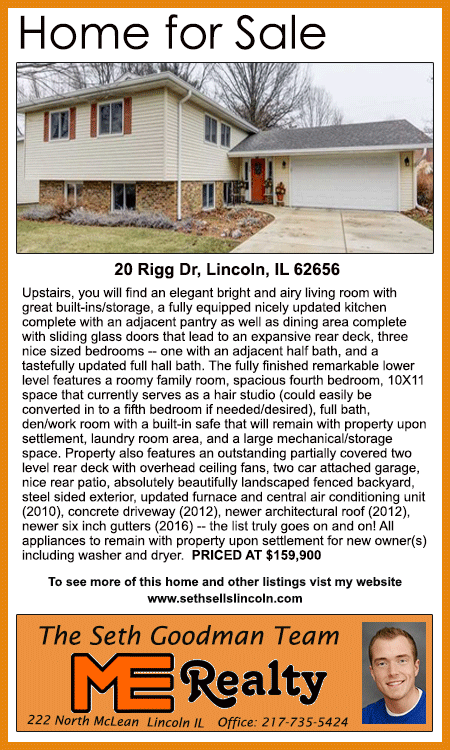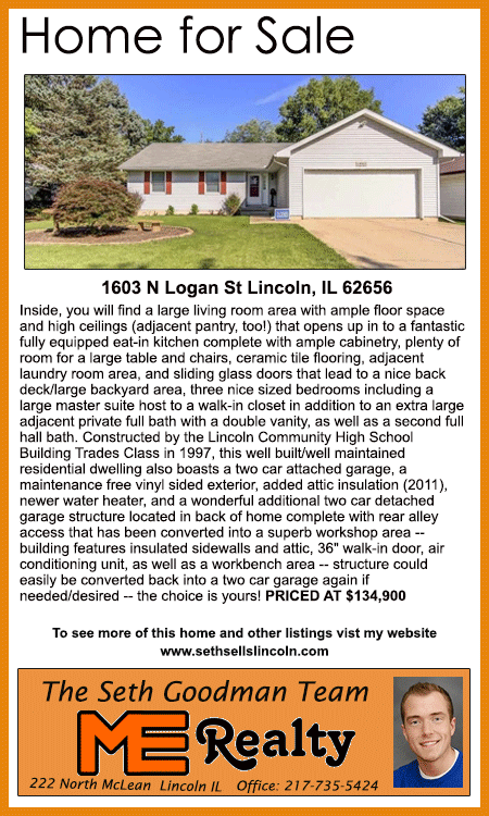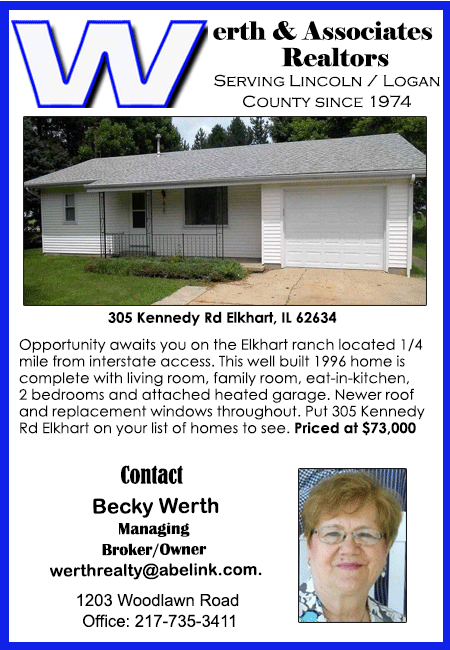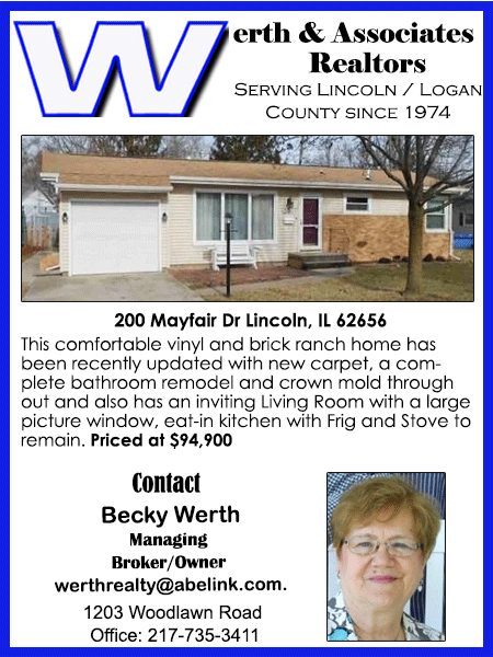 All real estate advertised in the Lincoln Daily News is subject to the Fair Housing Act for 1968 which makes it illegal to advertised "any preference, limitation, or discrimination based on race, color, religion, sex or national origin, or intention to make special preference, limitations, or discrimination."