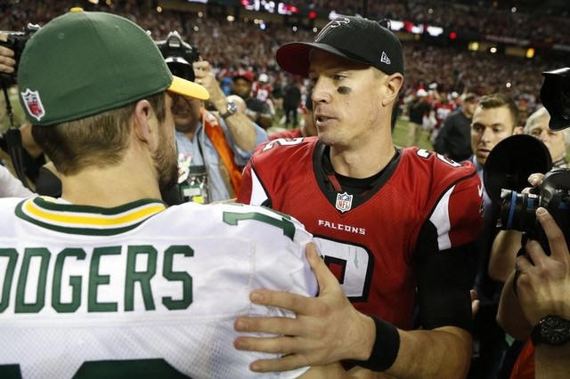 Falcons quarterback Matt Ryan (2) hugs Green Bay Packers quarterback
