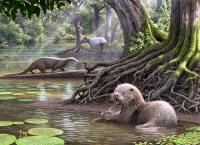 Two Siamogale melilutra individuals, one feeding on a fresh