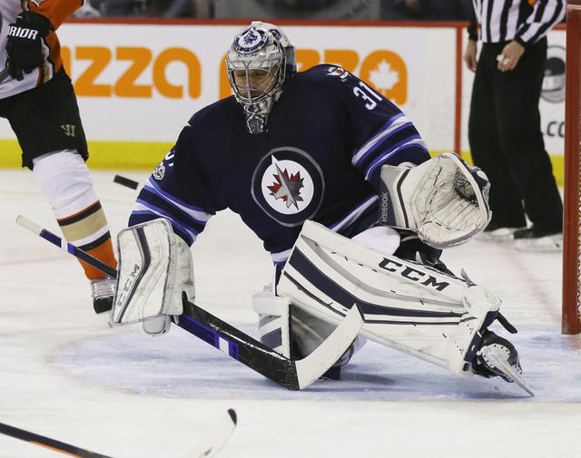 Jets goalie Ondrej Pavelec (31) watches an incoming puck during