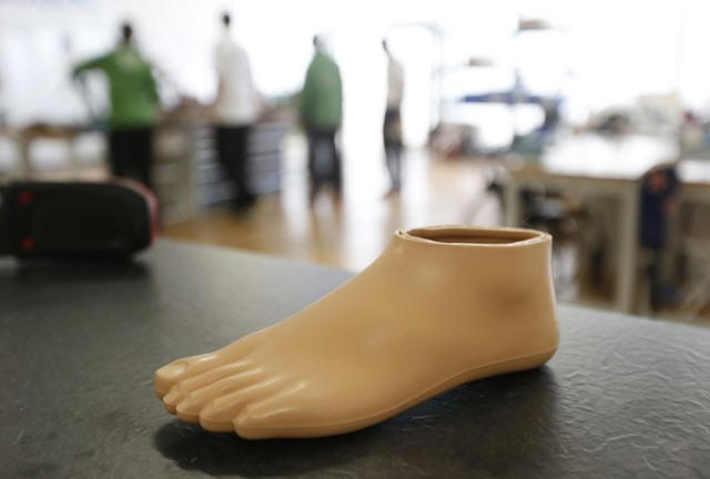 A prosthetic foot is seen on a work table in the Ottobock workshop