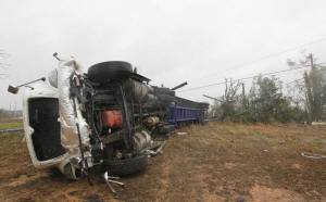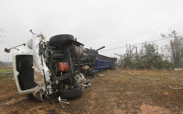 A tractor trailer lies on its side after a tornado struck a