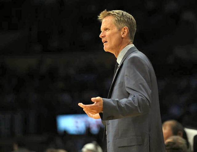 Golden State Warriors head coach Steve Kerr reacts during the first