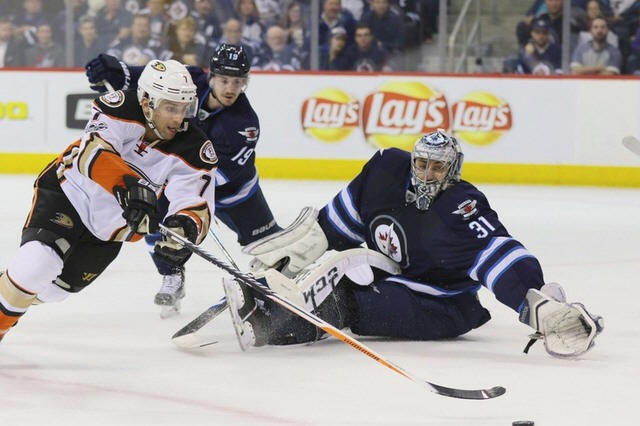Jets goalie Ondrej Pavelec (31) makes a save on Anaheim Ducks center