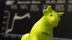 A bull figure is pictured in front of the German share price index DAX board at the German stock exchange in Frankfurt January 25, 2013. REUTERS/Lisi Niesner |