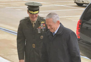 New U.S. Defense Secretary James Mattis (R) is greeted by Marine