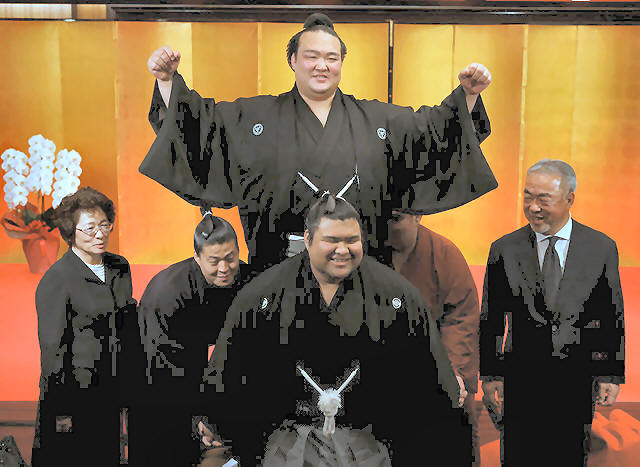 hoisted up by his stable's sumo wrestlers in celebration of his