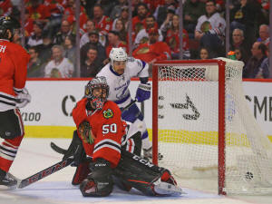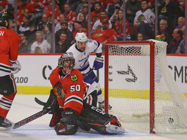 Blackhawks goalie Corey Crawford (50) watches a goal from Tampa Bay